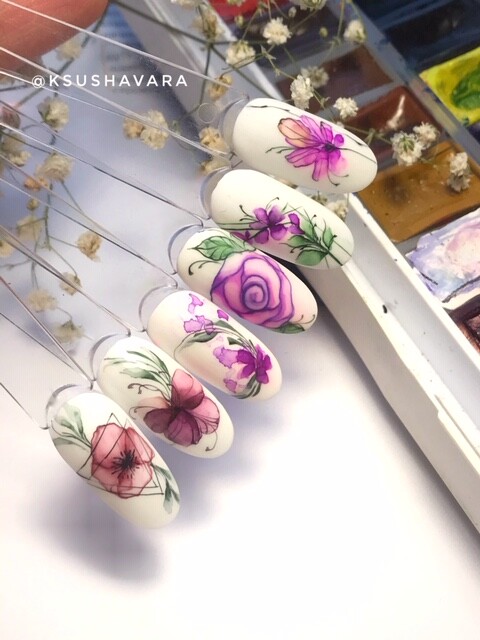 Акварельная роспись на ногтях — один из ведущих трендов современной маникюрной индустрии. Эта техника предполагает в себе использование гель-краски, разбавленной топом, или акриловых красок, или специального гель-лака, создающего эффект водянистости, что должен присутствовать в подобной технике на ногтях.